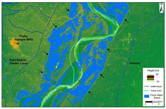 For example, the latest three major floods of the Indus River in 2010, 2011 and 2022 in Pakistan affected approximately 60 million people, reaching up to 3500 deaths [16,17,18]. Since the mid-20th century, Pakistan has experienced one major flood approximately every decade, mainly due to heavy monsoon rainfall. The multifaceted impact of these catastrophic events encompasses severe economic losses, dramatic humanitarian emergency, substantial damage to infrastructure, as well as the destruction of both the cultural and natural heritage of the country. The floods in 2010 caused an inundation of 71,000 km2 and hit around 900 thousand households [19,20]. In 2011, the floods inundated 21,000 km2 area, displaced 5.9 million people and damaged 1500 km of the road network, 382 km of railway tracks and 16,000 km2 of agricultural land [16].