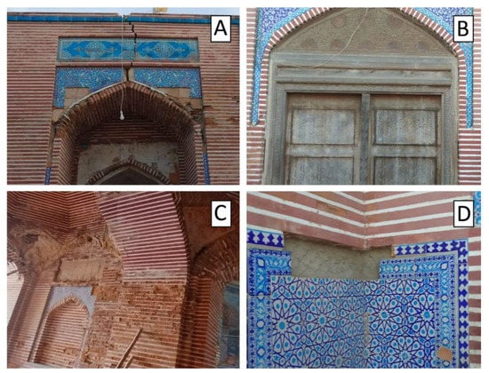 The Shah Jahan Mosque built in the mid-17th century CE is the main religious center in the city of Thatta, in the Sindh province (Figure 5A). The brickwork structure is considered one of the most elaborate stylistic examples in Asia [60]. Its fourinwan layout is characterized by 93 domes and two main chambers enriched with blue tiles decoration representing a mixture of Turkic and Persian styles (Figure 5B,C) [61].