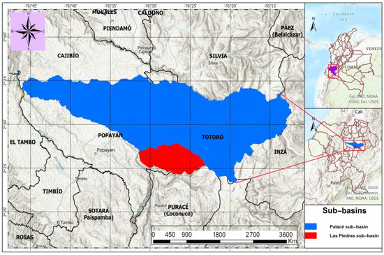The study areas selected for this research are the Las Piedras and Palacé River sub-basins, both located in the southwest part of Colombia. The study areas are presented in Figure 1. The Las Piedras River sub-basin [24] (in red) covers an area of approximately 66 km2 and is part of the larger Cauca River basin [25]. This sub-basin is characterized by a rugged topography, with steep slopes and narrow valleys. The main river, Las Piedras River, originates in the high Andean mountains and flows towards the southwest before merging with the Cauca River. The sub-basin is home to a rich array of flora and fauna, including several endemic species, and provides important ecosystem services such as water supply for agricultural and domestic use [24]. The Palacé River sub-basin [26] (in blue) covers an area of approximately 645 km2. It is located in the central and northeastern part of the Cauca department and includes the municipalities of Totoró, Cajibío, Silvia and Popayán, and is characterized by a mix of tropical and Andean ecosystems. The sub-basin is home to a rich diversity of flora and fauna, including several endangered and endemic species. The Palacé sub-basin is formed by six tributaries: Cofre river, Blanco river, Molino river, Chamizal creek, Guangubio river, and Minchicao river. The upper part of the sub-basin where Palacé river originates exhibits typical high-altitude páramo conditions, which are part of the Guanacas-Puracé-Coconucos páramo complex located in the Andean region spanning the Huila and Cauca departments. Agriculture is the main source of income in the upper part of the Palacé sub-basin, with potato cultivation and extensive livestock breeding serving as the major economic activities in the region [27]. These two sub-basins are important ecological and socio-economical resources that provide critical ecosystem services and support a rich diversity of flora and fauna in Colombia.