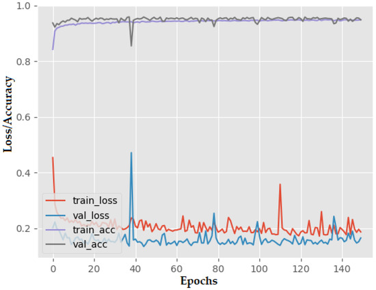 Once the optimal dataset parameters were established, which in this case were a kernel size of 3 × 3 for the images and 16 radiometric indices to form small twenty-seven-band sample images, the necessary parameters were established to produce a model that was robust enough without having a complex architecture that increased the computational cost associated with training such models. The number of layers in the model was an essential parameter because it determined its ability to learn and generalize patterns in the data. Since a small image size was used, it was not necessary to use many convolutional layers, so four of these layers were sufficient for the network to learn deeply and abstract representations of the dataset. Adding more layers only increased the complexity of the architecture and the computational cost, but not its performance. On the contrary, if fewer than four convolutional layers were used, the model would be too shallow and insufficient to learn from the data. The number of filters per convolutional layer was also a parameter manipulated to obtain an optimal CNN as it determined the number of features the network could detect in the input data. Each filter in the CNN convolutional layer was used to detect certain patterns and features in the data. In this research, having 100 filters in the first layer, 150 in the second, 300 in the third, and 530 in the last layer was essential to achieve a balance between the network representational capacity and generalization ability.