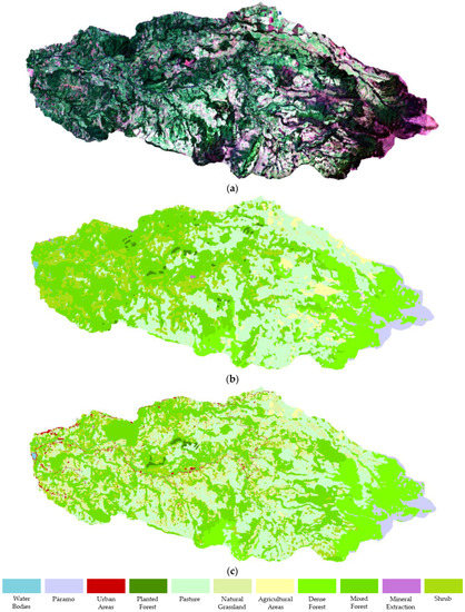 The Las Piedras sub-basin can be represented in different ways: natural color (a), 11 × 11 size images classification (b), and 3 × 3 size images classification (c).