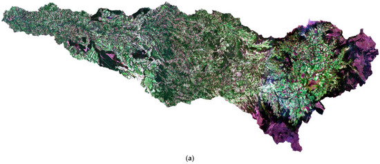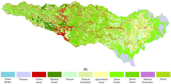 Figure 7 presents the true color image (Figure 7a) and the results (Figure 7b) for the Palacé sub-basin, which were obtained using the best model implemented on a dataset that was constructed from both sub-basins, as well as a dataset of images with 3 × 3 size. This configuration was chosen based on the results of tests that were conducted, which indicated that the best outcomes were achieved with this approach. The results of the qualitative analysis in this sub-basin, which is approximately 10 times larger in spatial extent than the Las Piedras sub-basin, show that, in fact, the previous parameters chosen for the model were the correct ones.