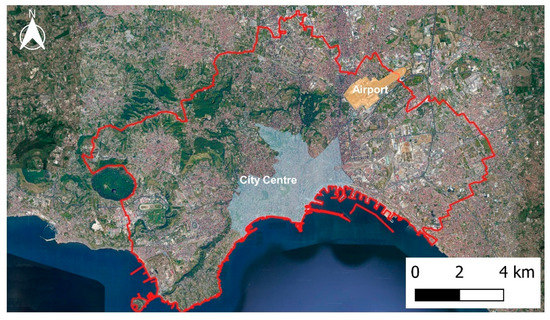The city of Naples lies on the west coast of the Italian peninsula, about 200 km south-east of Rome. With a population of almost a million, it is the third largest city in Italy after Rome and Milan. Its prominent position on the coast of the Mediterranean Sea, flanked by natural and historical beauties and a warm climate, make it one of the most attractive destinations for tourists during the summer season, with peaks reaching 3.7 million tourists [24]. Many arriving by air transportation must connect through the only airport in the city, known as Capodichino Airport. The latter is located in the north-east area of the city (Figure 1), about 4 km away from the city center, and currently it is connected only by road transport to the urban center (unless specifically stated, all subsequent figures are oriented such that the vertical upward direction indicates north and, consequently, the horizontal rightward direction indicates east).