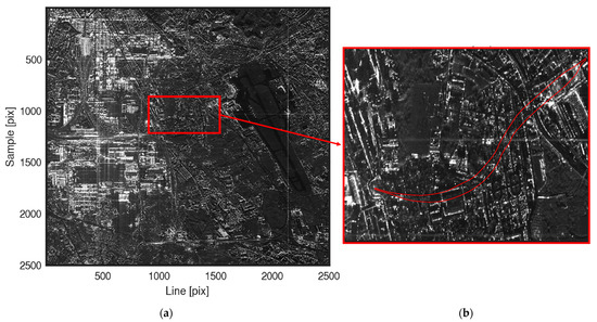 (a) Reflectivity map (RM) and (b) subset of RM showing the analyzed area and, in red, the tunnel alignments. Both figures are viewed in the local satellite coordinate system (line and sample directions, i.e., azimuth and range directions).