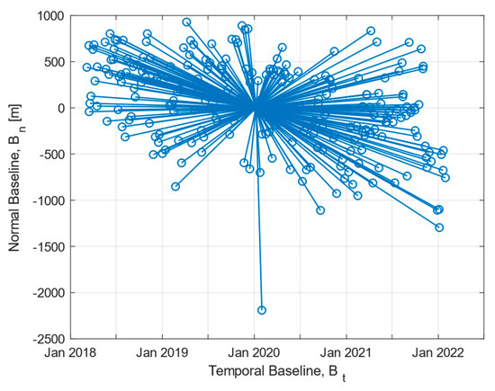 In the last decades, processing of data from synthetic aperture radar (SAR) satellites was used to obtain information on deformation processes of the Earth’s surface, caused by various phenomena including, but not limited to, earthquakes [5,6,7], natural subsidence [8,9], and volcanic movements [10,11].