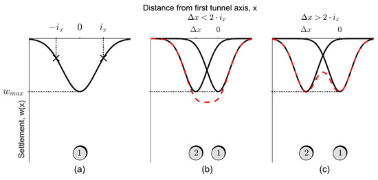 (a) Gaussian profile of settlements from Equation (1) with the indication of the tunnel position (1), inflection point distance ix, and maximum settlement wmax; (b) the black solid lines represent two Gaussian profiles of both tunnels (1 and 2) and the solid red line represents the superposition of effects using Equation (5) when Δx < 2·ix; (c) superposition of effects using Equation (5) when Δx < 2·ix.