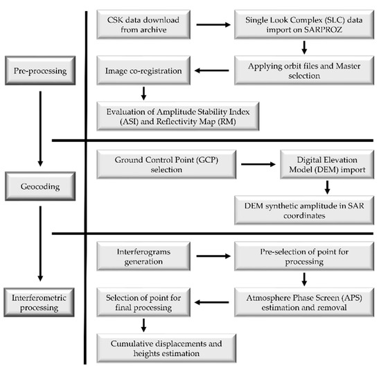 This work uses the PSI method, consisting of detecting pixels that show high coherence to retrieve the displacement map (better known as velocity map, mm/year) of the area of interest, using the software SARPROZ [21]. A flowchart of the data processing is presented in Figure 6.