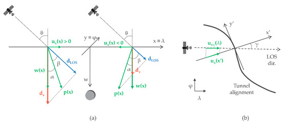 Nevertheless, it is crucial to assess the implications of this assumption. Considering the geometrical scheme of Figure 8a, i.e., when the tunnel cross section is contained in the LOS plane and the satellite is acquiring in ascending geometry, the intensity p(x) and the direction α(x) (to the vertical, positive if anticlockwise) of the actual (theoretical) displacement vector p(x) can be computed with the following: