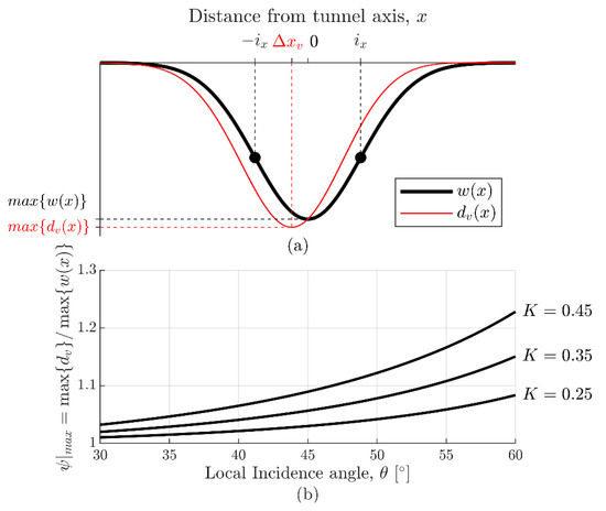 The quantification of the maximum settlement’s increment is explicated through the expression ψ|max = max{dv(x)}/max{w(x)}, the determination of which depends exclusively on the local angle of incidence ϑ and the geotechnical parameter K, as shown in Figure 9b. The shift of the settlement profile Δxv depends upon the local incidence angle, the geotechnical parameter K, and the tunnel axis depth z0. The shift is determined using the following equation: