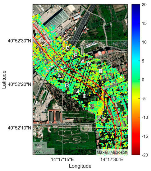 In Figure 11b, we present the cumulative displacements along the LOS from 2 July 2020 to 29 January 2022, representing those occurring as a result of both excavations. In this figure, we can see the presence of many measurement points affected by negative LOS displacements in the proximity of both tunnel axes, as expected, and displacements show movements close to zero away from both axes, as per Figure 11a.