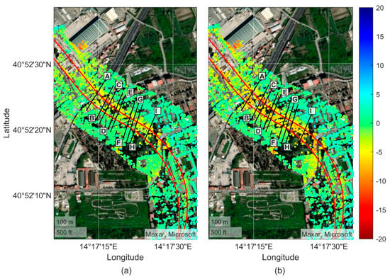 (a) Cumulative displacements in mm along the LOS occurring from to 2 July 2020 to 23 March 2021, owing to the excavation of the first tunnel (right red longitudinal axes); (b) cumulative displacements along the LOS occurring from to 2 July 2020 to 29 January 2022, owing to the excavation of both tunnels (images modified after Maxar for Microsoft). Sections A to I are the ones that will be investigated.