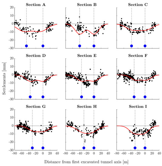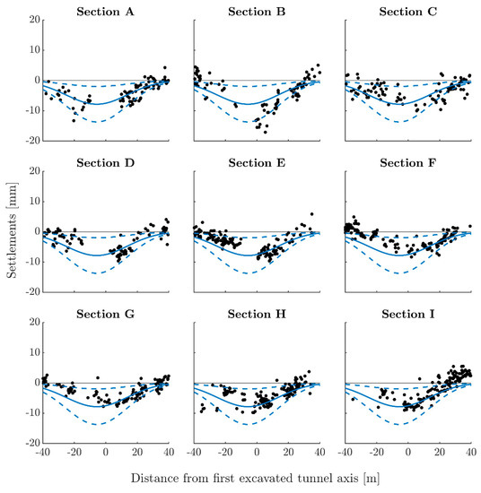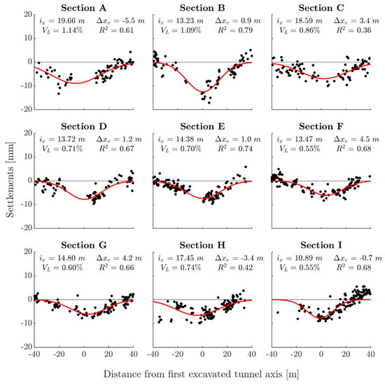 In Figure 13, the fitting on nine cross sections considered is presented. The correlation coefficients R2 are considerably high for all sections except for C and H. Nevertheless, all volume losses VL obtained from the best fit are in the expected range of 0.5% to 1% for TBM excavation. The maximum settlements dv from the best fit are 9.0, 12.5, 7.0, 7.8, 7.4, 6.1, 6.1, 6.5, and 7.7 mm for sections A to I, respectively. To retrieve the actual maximum settlement w, these values should be divided by the ψ|max, which, for ϑ = 50°, γ = 55°, and K = 0.25 ÷ 0.45, is equal to 1.01 ÷ 1.04.