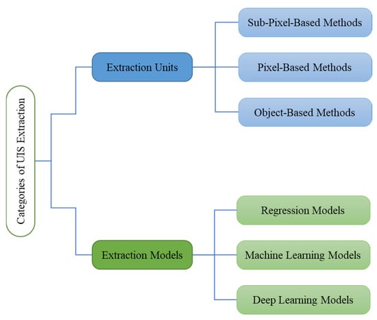 Traditional impervious surfaces are mainly characterized by spectral information from low spatial resolution satellite imagery rather than texture and local features. With the improvement of satellite sensors, high-spatial-resolution remote sensing images have become dominant. Clear boundaries, spatial structures, and texture features can be derived from high-resolution imagery to extract fine urban impervious surfaces. Various existing methods can be classified based on extraction units or involved models (see Figure 2).