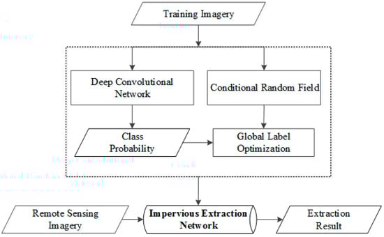 The workflow, depicted in Figure 3, consists of two complementary parts. In the first part, a remote sensing image is fed into a deep convolution network with de-convolution layers for discriminative feature learning. Then, a softmax classifier is used to predict the class probability for each pixel. In the second part, the remote sensing image is regarded as a graph, and a conditional random field (CRF) model with spatial consistency constraints is implemented for global label optimization.