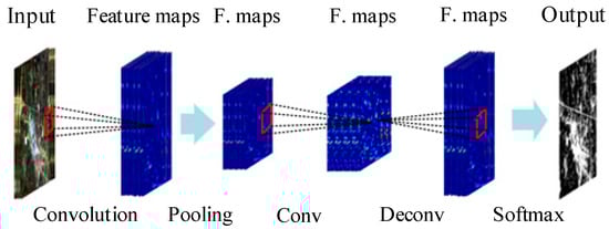 The deep convolution network for impervious extraction is shown in Figure 4. The network architecture consists of two main parts: a feature learning part and a classification part. The feature learning part is composed of standard convolutional neural networks (CNNs) with convolution layers and pooling layers. The classification part is composed of deconvolution layers and a softmax classifier. The output of the network is the predicted class probability for each pixel of the input image.