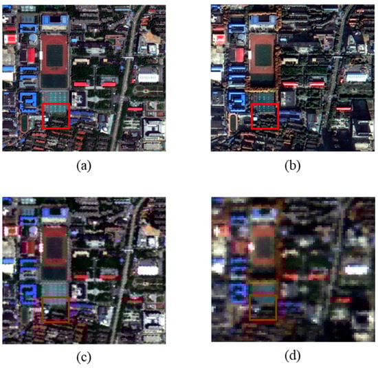 A comparison of remote sensing images with different spatial resolutions at the same geographical location. (a) Multispectral bands fused with panchromatic band in Gaofen-2 (0.8 m), 18 May 2020; (b) Multispectral bands fused with panchromatic band in Gaofen-1 (2 m), 11 December 2019; (c) Multispectral bands of Gaofen-2 (4 m), 18 May 2020; and (d) Multispectral bands of Gaofen-1 (8 m), 11 December 2019.