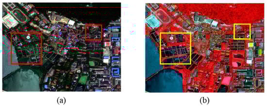 A comparison of remote sensing images in the visible and near-infrared bands. (a) True-color composites of Gaofen-2 images; (b) False-color composites of Gaofen-2 images.