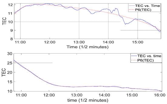The TEC data obtained were analyzed based on satellite visibility at the point of the thunderstorm event. The GPS satellites’ Pseudo Random Noise (PRN) was used for the identification of visible GPS satellites. TEC deviations during the thunderstorm were extracted from the computed TEC obtained from the visible PRN with the highest angle of elevation at the time of the event. Angles of elevation between 65° and 80° were mostly considered in this work. Additionally, we ensured that the GPS satellite that was tracked within the duration of the peak of events fell within the angle of 60–90 degrees. The method of polynomial filtering was used for the extraction of TEC deviations. A polynomial of order 6 was fit to the TEC to extract the disturbed TEC from the measured TEC for the period of the selected events [4,11,43]. The computation of the TEC deviation using the polynomial order 6 is as follows: