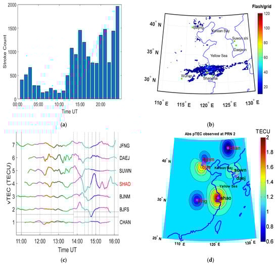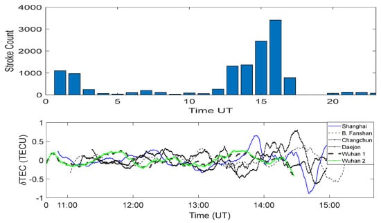 In addition to the system of overlapping sprites during the thunderstorm and the large-scale flashes (see Figure 4a), the tracing of the storm cell system using WWLLN also revealed a large-scale system around Shanghai. The resulting TEC deviation could be seen in the observation displayed in Figure 4b, which revealed a large TEC deviation during the periods with a large flash rate.