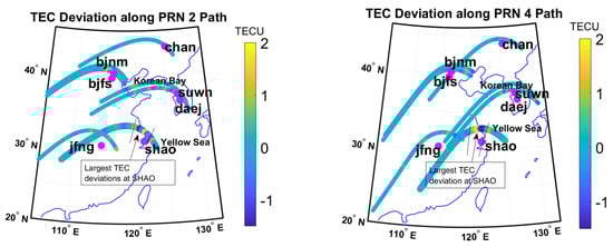 TEC deviation during the thunderstorm event on the satellite paths for PRN 2 (left panel) and PRN 4 (right panel), respectively, for the thunderstorm occurrence on the 21st of June 2021.