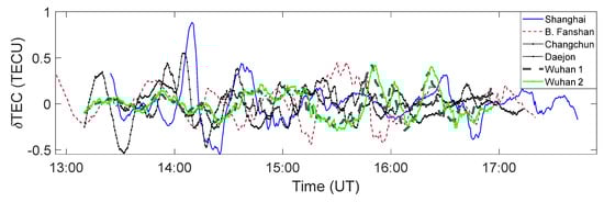 Convective activities in this region were also characterized by large flash rates in Shanghai (up to 1500 flashes per hour) and lower flash rates in Beijing (see Figure 3a,c). As a consequence of these convective activities, very large TEC deviations were computed for Shanghai and other areas with high proximity to the storm region. The spatial variation in TEC deviations over the region at the time of the storm was evaluated through the interpolation and extrapolation of the absolute peak TEC deviations in different locations during the event. The spatial variation in the absolute peak TEC also showed that the Shanghai and Beijing area experienced TEC perturbations of the highest magnitudes in this region (Figure 3a–d). Uniformed line plots of TEC deviations from June 2016 (see Figure 3b) show the wavelike perturbations of TEC for the stations closest to the storm event (such as the stations at Shanghai and Beijing), with the highest stroke count coinciding with the largest TEC deviations at 15:00 UT. As observed from Figure 3b,d, the TEC deviation in these regions was up to 2 TECU in magnitude, which is similar to results from other cases examined. The observed largest TEC deviations were (TEC measured at an ionospheric height of 200 km) from ~2 to ~2.2 TECUs accounted more than ~14% of the daily TEC average, in which the peak value for the average daily TEC was about 13 TECUs. Based on our initial examination of the TEC signatures obtained, the signal properties appeared to demonstrate that the dynamics of the ionospheric were being modified by acoustic and gravity wave dynamics associated with thunderstorm events. More findings are presented on the periodic and frequency domain analysis in Section 3.3. The flash counts for the thunderstorm events around Shanghai were particularly large, with the number of lightning strokes well above 1300 flashes per hour, which accounted for only 20% of the total flashes, based on the WWLLN detection method. This type of intense flash rate usually characterizes large convective activity. Considering the ionospheric TEC deviations, the highest deviations were recorded at about the same time as the largest stroke count. The TEC deviation at Shanghai was slightly greater than 2 TECUs, which was higher than the TEC deviation observed from the other stations.