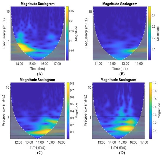 From the wavelet analysis (see example in Figure 10), we could observe that the main dominant frequencies for which the highest magnitude was observed in most cases ranged between 0.3 mHz and ~1.2 mHz, which accounted for a 13 min to 55 min periodic range. The second set of dominant periodic ranges obtained from the wavelet analysis was from 7 min to 13 min, and another less dominant but visible periodic range was 2–7 min. These frequency ranges are within the gravity wave, acoustic-gravity wave, and acoustic wave ranges, respectively, with the most dominant being in the gravity wave range.