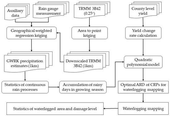 This study began by downscaling the long-term TRMM 3B42 precipitation product using APK to achieve fine-spatial-resolution precipitation estimates. The downscaled precipitation estimate was then combined with station-based rain gauge measurements and other auxiliary variables to obtain a more precise and accurate precipitation estimate. Based on the fused precipitation, the ARD of different CRPs was proposed as an indicator of waterlogging, and its impact on winter wheat yield reduction was quantified using a polynomial model. The optimal model between the ARD of CRPs and yield reduction was then used to create a spatial map of the waterlogging distribution. The waterlogged area and corresponding damage level were obtained for each growing season from 1998 to 2014. The overall framework is shown in Figure 2.