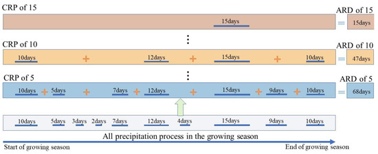 Excessive rainfall can refer to both heavy rainfall and a prolonged precipitation process. Our study specifically focused on the latter, which involves days of precipitation, especially for the CRPs. Although there is no widely accepted definition of CRPs, previous studies have defined them based on either rainy days or rainfall. For example, Ying Xiang et al. [44] defined a CRP as a precipitation process lasting at least 5 days with a total rainfall of at least 10 mm. Additionally, if the CRP lasts longer than 5 days, there can be no rainy days in the middle, but the proportion of rainy days in this CRP must be greater than 70%. The CRP ends when there is no precipitation (rainfall < 0.1 mm) for 3 consecutive days. We adopted this definition in our study. We first calculated the starting date, end date, and rainfall for each precipitation process in the growing season, and then counted the CRPs with durations from 5 to 15 days (Figure 3). We then added the rainy days with CRPs greater than a predefined minimum number of rainy days (e.g., 5 days) to obtain the ARD. For instance, there were 7 CRPs with more than 5 rainy days in one growing season, and the ARD for a 5-day CRP is 68 days (Figure 3). Similarly, the ARD for 10- and 15-day CRPs is 47 and 15 days, respectively.