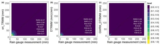 Scatter density plot of original TRMM (ori-TRMM, (a)), DTRMM (b), and DTRMM_GWRK (c) estimates compared with rain gauge observations from 1998 to 2014 and the corresponding quantitative error statistics.