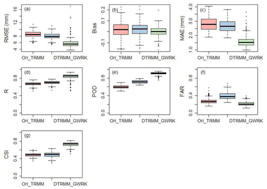 Figure 5 presents the box plots of the station-based RMSE, bias, MAE, R, POD, FAR, and CSI, to further evaluate the accuracy of the ori_TRMM, DTRMM, and GWRK_DTRMM estimates. The results show little difference between ori_TRMM and DTRMM, with the median R ranging from 0.67 to 0.70, possibly due to the accuracy of the original TRMM. However, as a result of the fusion with the rain gauge measurements using GWRK, a significant increase in accuracy is observed, with the median RMSE decreasing from 7.88 to 5.57 mm, median R increasing from 0.70 to 0.85, and median MAE decreasing from 2.65 mm to 1.52 mm.