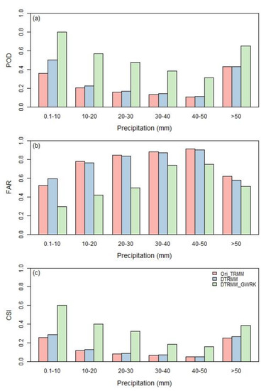 The accuracy of POD (a), FAR (b), and CSI (c) of TRMM 3B42, DTRMM, and DTRMM_GWRK at different daily precipitation levels.