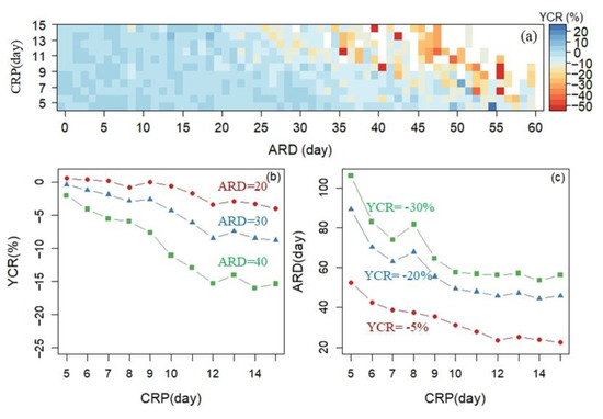 Figure 7a presents a heatmap of the YCR of different combinations of ARDs and CRPs. The figure shows that higher ARDs, particularly for longer CRPs, are always associated with a greater yield reduction. With a low ARD, there are no significant differences in the YCR between different CRPs (red line in Figure 7b). However, with a higher ARD, the greater the CRP, the greater the yield reduction (Figure 7b). For example, with an ARD of 40 days, the YCR is −15.4% with a CRP of 15 days, while it is only −2% for a CRP of 5 days. Conversely, for the same yield reduction, a longer CRP corresponds to a lower ARD (Figure 7c). For instance, with a YCR of −20%, the ARD is 89 days for a CRP of 5 days, and only 45 days for a CRP of 15 days.