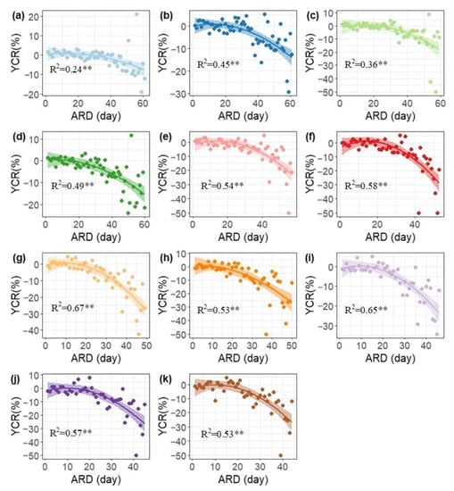 Scatter plots of the YCR and ARD for CRPs of 5 days (a), 6 days (b), 7 days (c), 8 days (d), 9 days (e), 10 days (f), 11 days (g), 12 days (h), 13 days (i), 14 days (j), and 15 days (k). Note: ** means the determination coefficient is significant at the p ≤ 0.01 level.