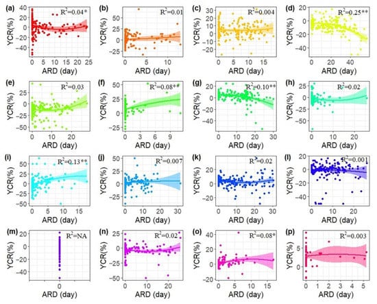 Scatter plots of the county-level YCR and the corresponding mean ARD for a CRP of 11 days from the 1998–1999 to 2013–2014 (a–p) growing seasons with the quadratic polynomial fitting line and 95% confidence interval. The fitting R2 is also presented. Note: * and ** means the determination coefficient is significant at the p ≤ 0.05 and p ≤ 0.01 level, respectively.