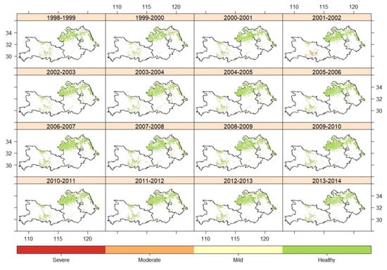 The mapping of waterlogging damage based on the estimated YCR and the proportion of waterlogged area with three waterlogging levels are shown in Figure 10 and Figure 11, respectively. Different levels of waterlogging were observed in 10 out of 16 growing seasons from 1998 to 2014. Additionally, the 2001–2002 growing season was a typical wet season, with severe, moderate, and mild waterlogging occurring in 5.72%, 2.00%, and 0.63% of the winter wheat area, respectively. These areas were mainly located in Tianmen and Jiangling and Gongan Counties in Hubei, as well as south of Anhui and Jiangsu. In the 2002–2003 growing season, mild waterlogging was observed in Tongling, Langxi, and Guangde in the south of Anhui. In addition, no waterlogging occurred in the dry growing seasons, such as in 1999–2000 and 2010–2011.