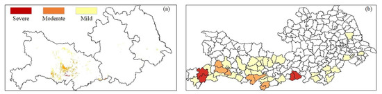 The county/station-level waterlogging risk map of typical wet years based on the rain gauge dataset shows a similar temporal pattern to the spatial waterlogging mapping, with higher waterlogging damage located in the middle of Hubei and south of Anhui (Figure 12b). It is worth noting that counties that suffered a high waterlogging risk according to the rain gauge measurements are not shown on the corresponding waterlogging map based on the DTRMM_GWRK estimates (Figure 12a), which means that the actual damage was not necessarily serious in these areas. This is because no winter wheat was extracted, such as in Susong County in Anhui and Huangmei County in Hubei. According to risk-assessment-related theory, risk estimation should consider the threat intensity, exposure, and vulnerability of physical entities [49]; if there were no winter wheat, then waterlogging loss would not exist. However, in those areas with a high waterlogging risk, local smallholders could have adopted strategies to avoid this risk by planting more tolerant varieties and switching to another crop, or even abandoned the growing season [50,51].