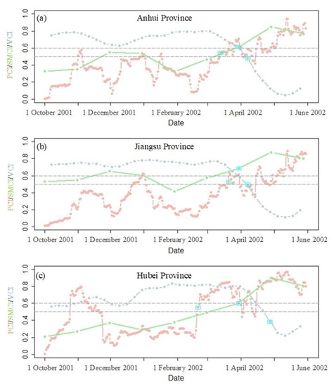 Variation in PCI, SMCI, and VCI in Anhui (a), Jiangsu (b), and Hubei (c) from October 2001 to May 2002.