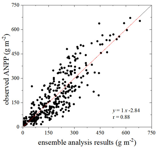 In order to obtain a better result, the ANPP results estimated from the four different ML models were used in BMA ensemble analysis. The results showed that ensemble analysis produced higher r (0.88) and lower RMSE (73.54 g m−2) values compared to each single ANPP estimation model (Figure 2). The two combinations fit very closely to the 1:1 line, which suggested that the predicted values were strongly in agreement with the measured values.