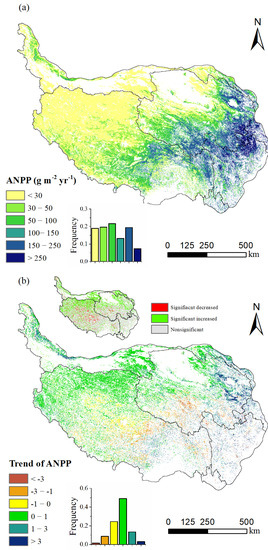 (a) Spatial distribution pattern of ANPP, and (b) temporal change trend (2000–2018) of ANPP in Tibetan Plateau grassland.