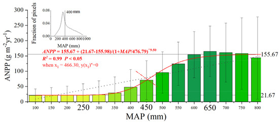 According to the description of this S-shaped growth curve (logistic function) fit (the red curve in Figure 4), the response of ANPP to precipitation could be divided into four stages: stationary, rapid growth, slower growth, and saturation. First, when the MAP was less than 250 mm, the ANPP of grassland was in a stable stage and basically remained at approximately 21.67 g m−2 y−1. Then, when the MAP was between 250 and 450 mm, grassland ANPP increased with increasing MAP, and the growth rate showed an upward trend. However, 466.30 mm was a tipping point. When the MAP was greater than this point, ANPP still increased with increasing MAP, but the growth rate showed a downward trend. Then, grassland ANPP reached its peak at a MAP of 650 mm. Above 650 mm, a slight decrease was observed in ANPP with increasing MAP, and ANPP no longer responded to precipitation changes.
