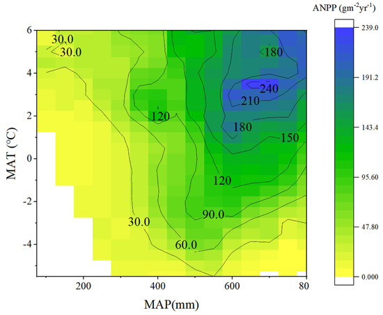 To further understand the effect of the interaction of precipitation and temperature conditions on the ANPP distribution, the mean ANPP values were calculated using MAT and MAP (Figure 5). The interaction defines a multidimensional response surface where the ANPP response to temperature and precipitation approximates a ridge, with the largest ANPP occurring over the averaged levels of MAT and MAP. More specifically, the larger values of ANPP (>180 g m−2 y−1) occurred mainly in the area where MAP exceeded 600 mm and MAT was greater than 1 °C. In the arid region (MAP < 200 mm), when the MAT was less than −4 °C, the ANPP was less than 30 g m−2 y−1. In the cold region (MAT < −4 °C), when the MAP was less than 400 mm, the ANPP was less than 30 g m−2 y−1.