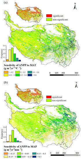 The sensitivity of ANPP to temperature in grasslands on the TP, obtained by means of regression analysis, in most areas was positive (approximately 66% of the grassland in the TP region) (Figure 6). Among them, in approximately 18% of these areas, the sensitivity to temperature was greater than 12 g m−2 y−1 °C−1, suggested that an increase in MAT of 1 °C corresponded to an ANPP increase of at least 12 g m−2 each year. These pixels were mostly located in the eastern part, and precipitation was relatively favorable. Much less negative temperature sensitivity was observed than for those pixels that exhibited the expected promotion with climate warming; these observations occurred in a few parts of the central Tibet area and accounted for only approximately 4.4% of the grassland.