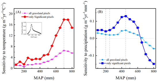 As we observed along the precipitation gradient, ANPP was more sensitive to inter-annual changes in MAT in the humid area (i.e., the region with relatively higher multi-year averages of precipitation) (Figure 7). The temperature sensitivity of ANPP generally increased from the area with less precipitation (100 mm MAP, temperature sensitivity: 1.10 g m−2 y−1 °C−1) to the wetter area (700 mm MAP, temperature sensitivity: 6.54 g m−2 y−1 °C−1). However, when the MAP was greater than 700 mm, the temperature sensitivity decreased slightly. In total, an increase in the long-term average MAP of 50 mm corresponded to an increase in the temperature sensitivity of 3.04 g m−2 y−1 °C−1 within the areas with MAP ranging from 100 to 800 mm, and the rate of increase in the temperature sensitivity was 0.01 g m−2 y−1 °C−1 mm−1.