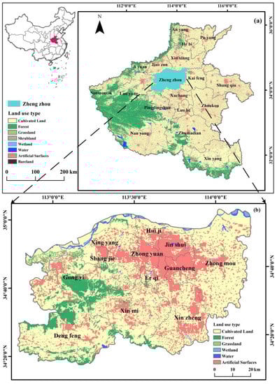 Land use and land cover map of Zhengzhou City in 2020 (Source: Ministry of Natural Resources of the People’s Republic of China (30 m spatial resolution): http://www.globallandcover.com/, accessed on 5 May 2022).
