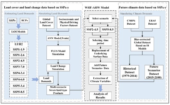 Furthermore, most scholars have started to study the drivers for assessing the future impacts of global and regional climate change due to specific land use transitions under SSPs and RCPs scenarios, i.e., future LUCCs on climate under different SSP-RCP(SSPx-y) pathway scenarios. Bukovsky et al. [19] used Regional Climate Model (RCM) simulations to assess the combined impacts of greenhouse gases (GHG) forcing climate change and LUCCs in major regions of the United States under SSPs scenarios. The study shows that urbanization is an extreme way for humans to change land surface properties and affect the local climate in urban areas. Under the SSP scenario, LUCC significantly affects climate projections in different ways, with annual mean temperature increase decreasing with the expansion of large amounts of forested cropland. Dong et al. [5] assessed the climate impacts of land use/cover change changes in China under different SSP-RCPs land use datasets using the WRF model to compare regional meteorological changes due to historical and future land use. It was shown that urbanization-led near-surface temperatures show an increase in the three future scenarios and that precipitation decreases and the climate becomes drier with land use change, more extensive urbanization, and higher RCP effects. However, these studies have mainly focused on the national or global level and explored the future climate simulation results in combination with models and different SSP-RCPs, but have not conducted downscaling studies on the future climate of individual urban areas.
