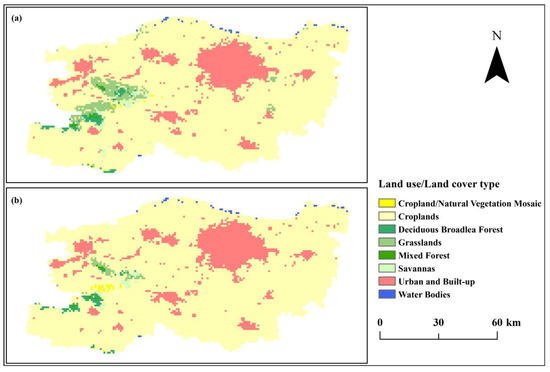 Distribution of land use/cover area in Zhengzhou in 2030 (a) and 2060 (b) in the SSP2-4.5 scenario.