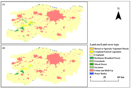 Distribution of land use/cover area in Zhengzhou in 2030 (c) and 2060 (d) in the SSP5-8.5 scenario.