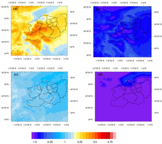 In this study, we used the T2 (the temperature at 2 m height above ground) difference between the SSP5-8.5 scenario and the SSP2-4.5 scenario (Figure 5 and Figure 6) to quantify the effect of the combination of LUCC and meteorological change on temperature change in Zhengzhou City amidst different scenarios. Figure 5 shows the difference in mean T2 between the two scenarios, SSP5-8.5 and SSP2-4.5, in January, April, July, and October of 2030 (SSP5-8.5–SSP2-4.5). The results indicate that the general trend of T2 variation around the main city of Zhengzhou is “increasing” in January and July, with a general increase of 1 to 2.6 °C, especially in the southwestern part of China during January. In April and October, the average T2 in the SSP5-8.5 scenario is significantly lower than that of the SSP2-4.5 scenario, especially in October, when the general area around most of Zhengzhou City decreases by more than 1.5 °C. Figure 6 shows the difference between the mean T2 in January, April, July, and October for the SSP5-8.5 and SSP2-4.5 scenarios in 2060. The results indicate that, accounting for urban expansion in different SSP-RCP scenarios and human economic and social impacts, the overall trend of the T2 change around Zhengzhou City in the SSP5-8.5 scenario is “increasing” in January and July, which is more notable than the warming of the SSP2-4.5 scenario.