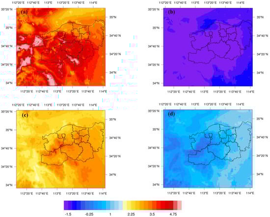 First, we found that the T2max and T2ave increase the most in January and July. In the SSP2-4.5 and SSP5-8.5 scenarios, the T2ave was approximately 0.17 °C and 29.4 °C and 0.3 °C and 30.6 °C in January and July in 2030, respectively, while in 2060, this change was 2.77 °C and 30.4 °C and 4.27 °C and 33.8 °C, respectively. We found that the T2ave was approximately 2.6 °C higher in January than SSP2-4.5 for the SSP5-8.5 scenario, while the T2ave was approximately 3.2 °C higher in July than SSP2-4.5. Additionally, T2max was approximately 6.5 °C and 39.3 °C and 13.6 °C and 39.9 °C in January and July in 2030, respectively, while in 2060, this change was 8.0 °C and 39.4 °C and 14.6 °C and 46.4 °C, respectively. In particular, the T2max in July 2060 reached a staggering 46.4 °C. The city experienced extreme heat, which posed a threat to the lives of city residents. Due to such results, the government should initiate emergency management measures for the city’s hot weather.