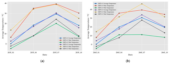 In addition, the T2ave (average temperature of T2), T2min (minimum temperature of T2), and T2max (maximum temperature of T2) for January, April, July, and October in both the SSP2-4.5 and SSP5-8.5 scenarios extracted from the total LUCCs and meteorological changes under the same scenarios described above indicate the following (Figure 7): In 2030, the T2min of SSP5-8.5 in January is approximately 2.5 °C higher than that of SSP2-4.5, and the T2min of SSP5-8.5 in July is approximately 4.1 °C higher than that of SSP2-4.5; however, the T2min of SSP5-8.5 in April is approximately 0.1 °C lower than that of SSP2-4.5, and the T2min of SSP5-8.5 in October is approximately 0.75 °C lower than that of SSP2-4.5. The T2max of SSP5-8.5 in January is approximately 7.07 °C higher than that of SSP2-4.5, the T2max of SSP5-8.5 in April is approximately 0.7 °C lower than that of SSP2-4.5, the T2max of SSP5-8.5 in July is approximately 0.4 °C lower than that of SSP2-4.5, and the T2max of SSP5-8.5 in October is approximately 5.2 °C lower than that of SSP2-4.5. In 2060, T2min of SSP5-8.5 in January is approximately 2.5 °C higher than that of SSP2-4.5, and T2min of SSP5-8.5 in July is approximately 3.6 °C higher than that of SSP2-4; however, the T2min of SSP5-8.5 in April is approximately 3.3 °C lower than that of SSP2-4.5, and the T2min of SSP5-8.5 in October is approximately 5.2 °C lower than that of SSP2-4.5. The T2max of SSP5-8.5 in January is approximately 6.5 °C higher than that of SSP2-4.5, and T2max of SSP5-8.5 in July is approximately 6.9 °C higher than that of SSP2-4.5; however, the T2max of SSP5-8.5 in April is approximately 4.2 °C lower than that of SSP2-4.5, and the T2max of SSP5-8.5 in October is approximately 2.7 °C lower than that of SSP2-4.5. In this study, we use the WRF model; thus, we can quantify the urban temperature changes due to LUCCs for different SSP-RCP future scenarios.